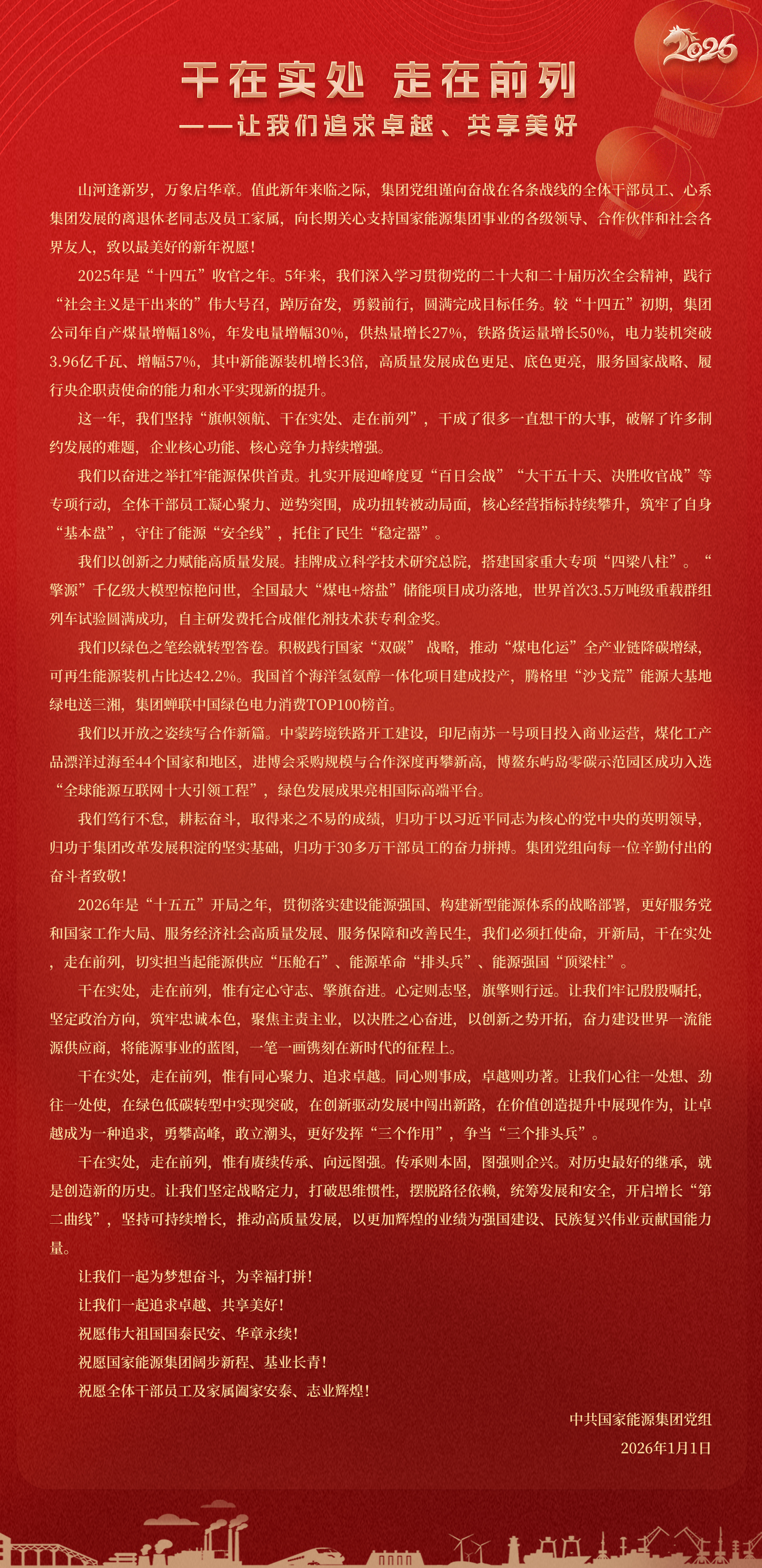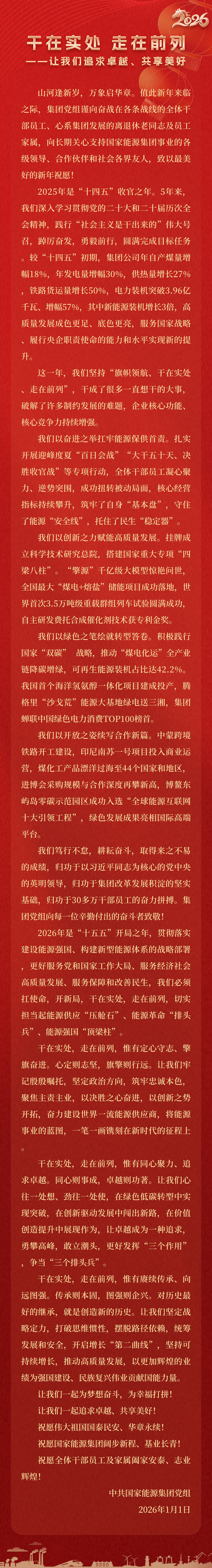 國家能源集團(tuán)胸懷“國之大者”,增產(chǎn)增供、穩(wěn)價(jià)穩(wěn)市,積極服從服務(wù)國家戰(zhàn)略、保障國家能源安全、助力國民經(jīng)濟(jì)穩(wěn)增長,推動(dòng)煤炭安全綠色智能、煤電清潔高效穩(wěn)定、現(xiàn)代煤化工高端多元低碳、運(yùn)輸物流協(xié)同一體、新能源多元?jiǎng)?chuàng)新規(guī)模化發(fā)展,全力擔(dān)當(dāng)能源強(qiáng)國頂梁柱,能源供應(yīng)壓艙石,能源革命排頭兵。